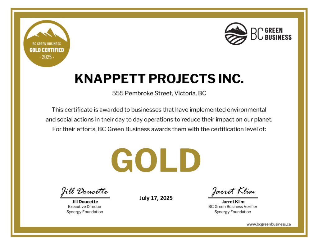 - November 2025 Achieved BC Green Business Certification for both our office and onsite.